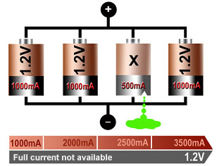 Một cell có nội trở cao hoặc bị lỗi không gây ảnh hưởng quá nghiêm trọng như trên bộ pin ghép nối tiếp, tuy nhiên nó sẽ làm giảm dung lượng và tổng dòng xả có thể của bộ pin. Nếu xảy ra đởn mạch, việc này sẽ nguy hiêm hơn so với bộ ghép nối tiếp. vì khi đó cell này sẽ rút toàn bộ năng lượng từ các cell còn lại, dẫn tới tăng nhiệt độ và cháy nổ.